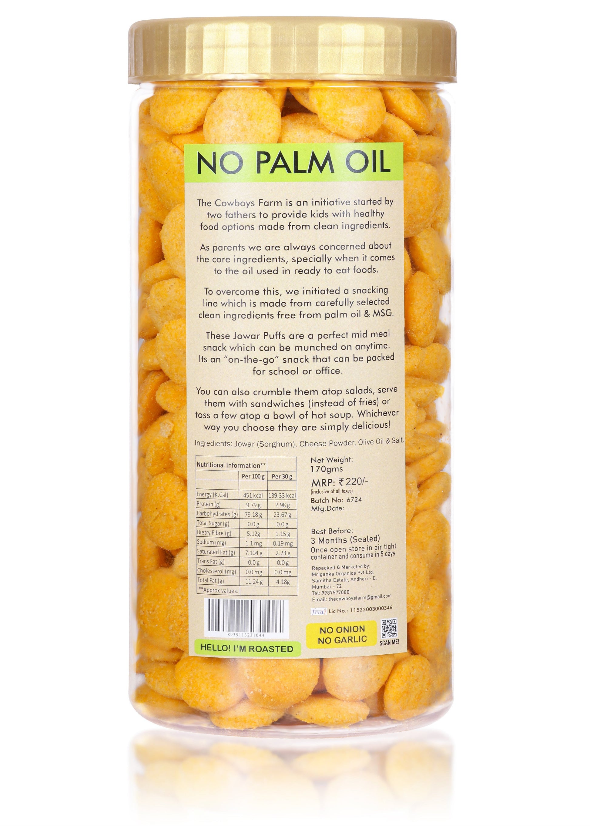 Ingredients You Can Trust: Our puffs are made with jowar flour, a delicious cheese seasoning (without maltodextrin!), cold-pressed olive oil for seasoning, milk, milk solids, and a touch of salt.